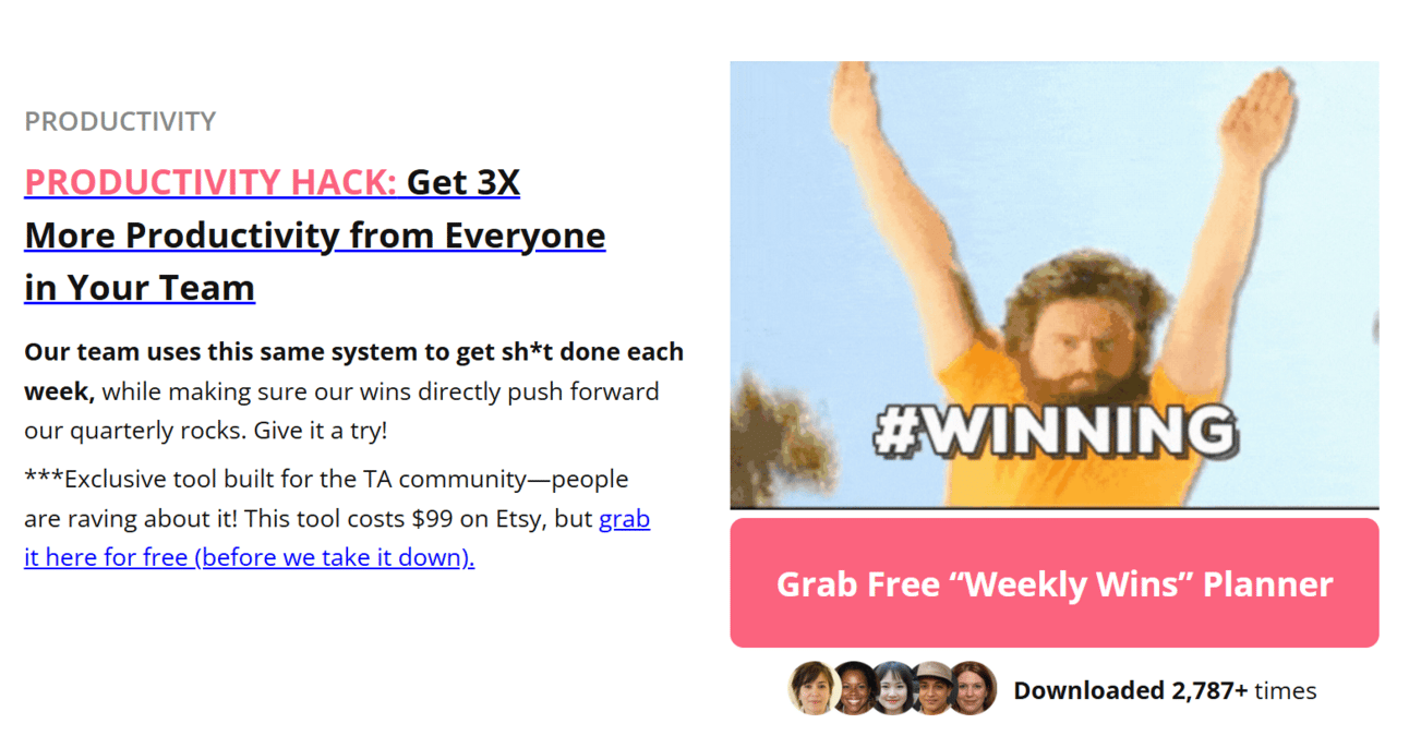 Co-branded Lead Magnets: A weekly wins planner Joanna (Co-founder + CEO) co-created with Miro. It includes templates for goal setting, deadlines, and celebrating team wins.