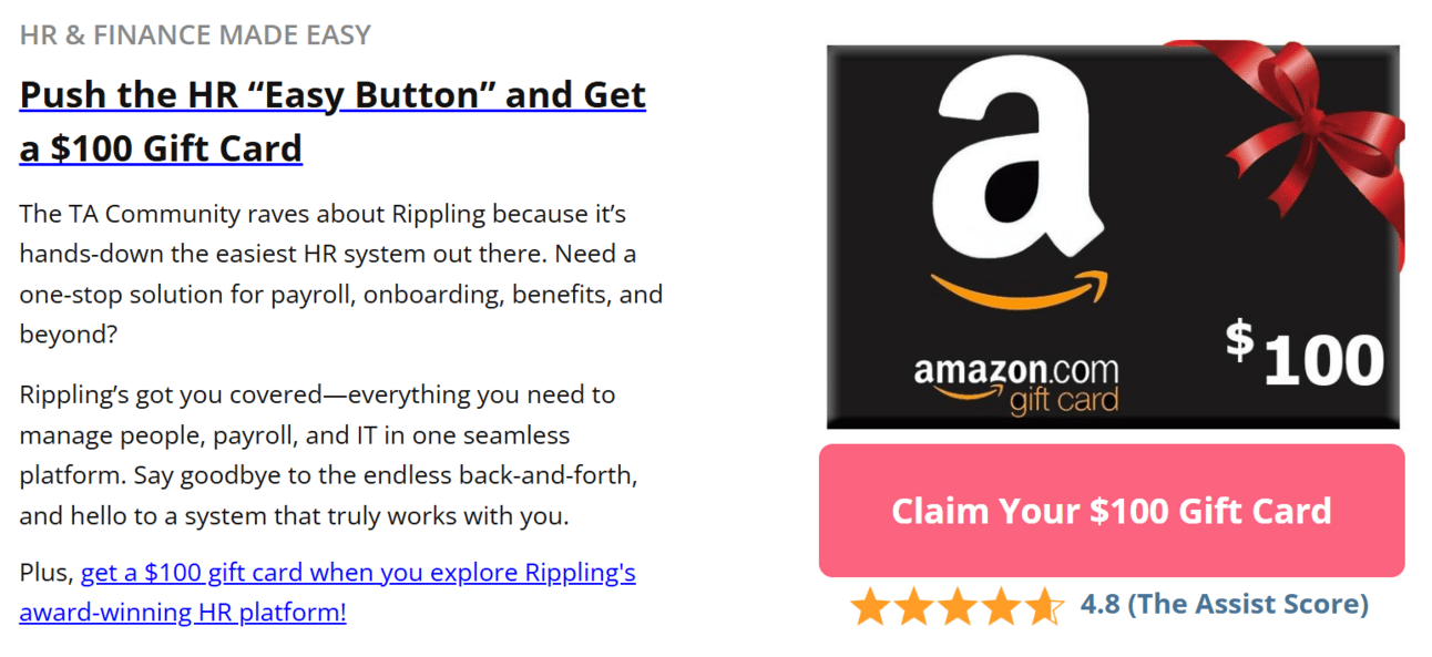 Incentivized Lead Gen: Rippling offers people a $100 gift card to members of The Assist who put themselves in as a lead on their page. High-value SaaS company, high LTV, happy to pay for qualified leads.