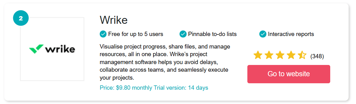 Trial Offers: Wrike offers a simple trial start, explaining why their tool will "cut 83% of your meetings" by implementing their project management software.
