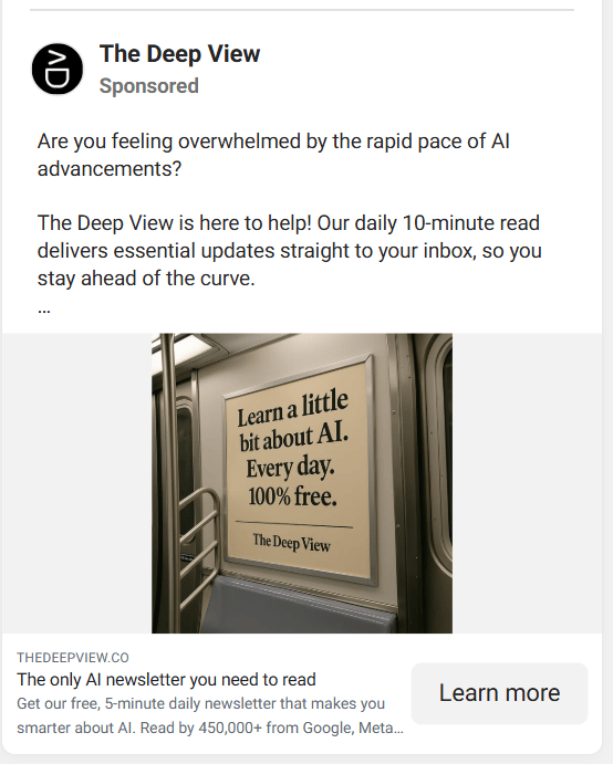I posted this (+ a few other AI-generated ads) on LinkedIn… a few days later, it was popping up in the ad accounts of other AI newsletters. Fast!